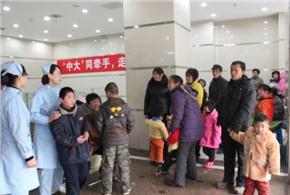 2013年1月23日上午9点,西安中大耳鼻喉医院耳病诊疗的接待大厅里走进来18名福利院的孩子,稚嫩而欢快的童声充满大厅,使平日肃穆的医院平添了几分生气,细心的护士送上一杯杯水,工作人员向前拥抱着可爱的孩子们……“‘中大’与你同牵手,走进你世界”公益主题活动由此拉开序幕。
