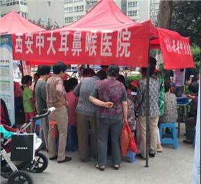 5月31日一大早,西安海容阳光城社区广场上就人头攒动,西安晚报邀请到西安中大耳鼻喉医院走进社区开展公益义诊活动,社区居民排着队,他们一边互相诉说着自己的身体状况,一边等候着中大医院医生为他们排忧解难。