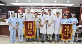 樊先生出院时检查显示:左外耳道无充血肿胀,无异常分泌物。为表示感谢,樊先生特意为中大张全安教授和医护人员送来锦旗:“医德传四海,医术克顽症”“医术精湛,情暖人心”。临走前他紧紧地握住张教授的手:“感谢您治好了我的耳朵愿您身体安康!”