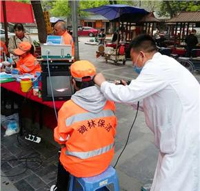 义诊活动现场,还吸引了一群在附近工作的环卫工人。由于环卫工人工作强度大,通常在环境嘈杂的路边作业,吸入灰尘、汽车尾气等有害物质较多,很容易患耳鼻喉相关疾病,医护人员在义诊检查的同时,针对环卫工人的工作状况和易患疾病做了详细的解说,并给与了一系列建议,叮嘱其在工作中做好预防措施,避免疾病侵扰。